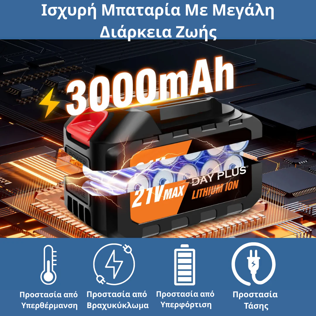 Η μπαταρία διαρκεί συνήθως περίπου 3–6 ώρες συνεχόμενης χρήσης, ανάλογα με τη ρύθμιση της πίεσης και το είδος της εργασίας. Μπορεί να επαναφορτιστεί γρήγορα για την επόμενη χρήση σας.